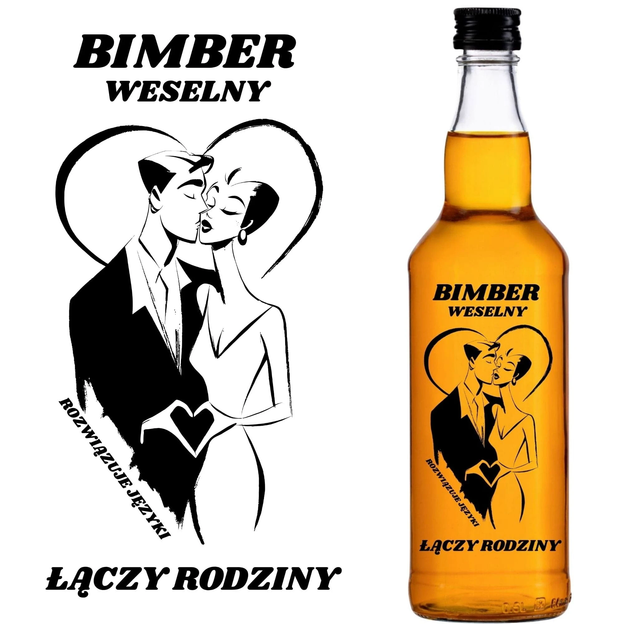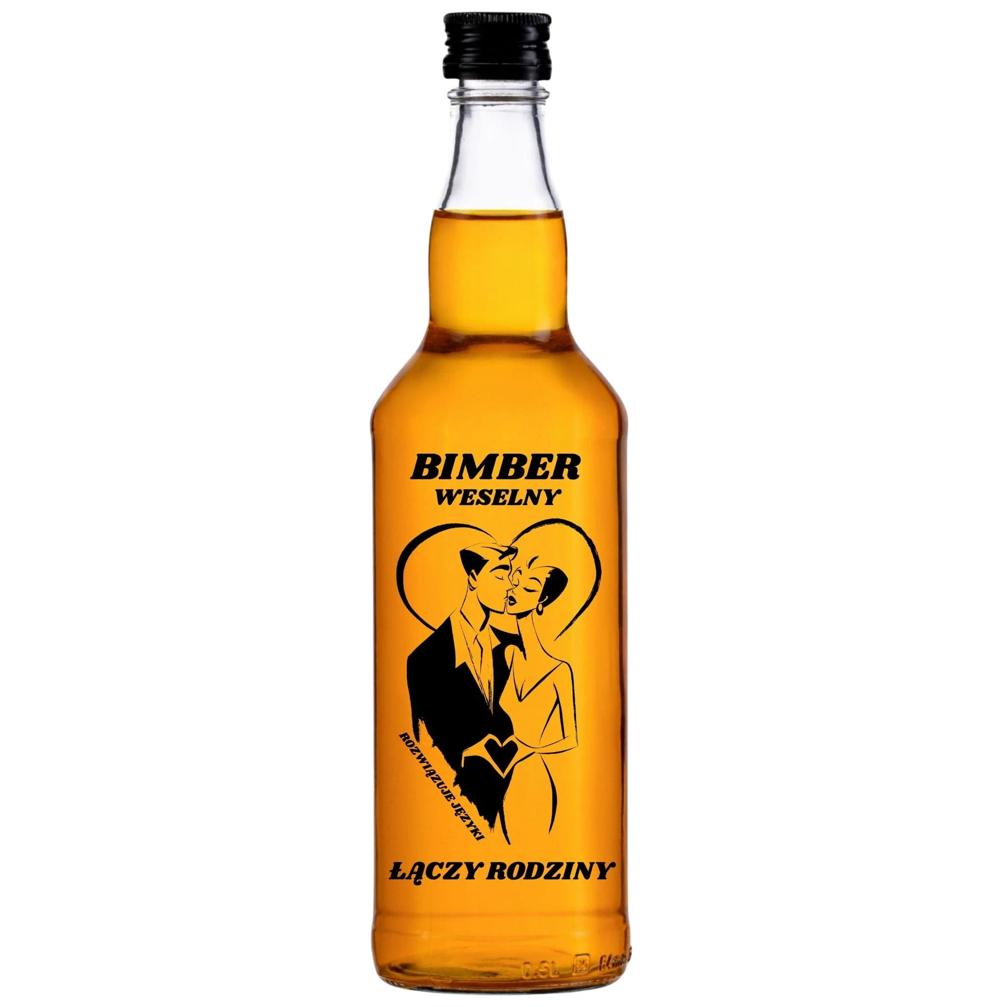 Pakiet 20 flaszek to rewelacyjne uderzenie na kluczowe stoły weselne. Sprawdzi się wybornie jako elitarne szkło na destylaty, czystą weselną oraz owocowe, słodkie nalewki. Czarna grafika całującej się pary genialnie kontrastuje z jasnym alkoholem. Pamiętając o tym, że na jutrzejszy poranek zaplanowałeś wielkie zacieranie pod swoją mistrzowską cytrynówkę, zalej nią cały ten 20-pak! Słonecznie żółty płyn w zestawieniu z czarną, romantyczną grafiką stworzy obłędne ozdobne opakowania szklane, które zachwycą każdego konesera i wywołają uśmiech.