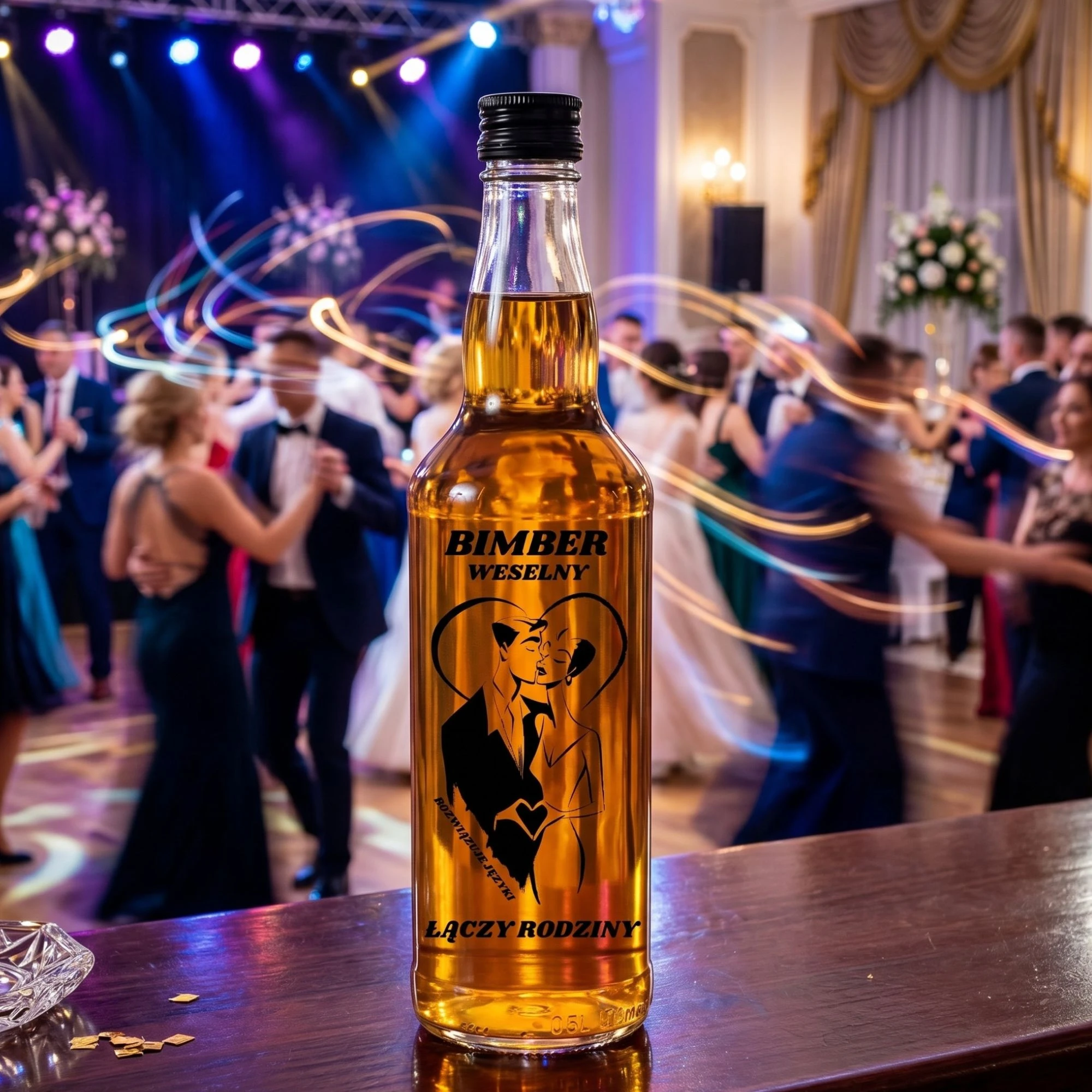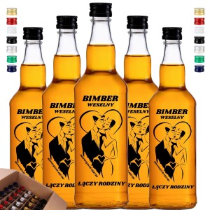 Przygotowujesz elegancką oprawę dla swoich trunków i szukasz szkła z prawdziwym charakterem? Zgarnij profesjonalny zestaw 20 sztuk sprawdzonych butelek szklanych w klasycznej linii monopolowej o pojemności 500ml. Te wyjątkowe, smukłe karafki wyróżnia wtopiony, czarny sitodruk z romantycznym motywem całującej się pary i hasłem "Bimber Weselny - Rozwiązuje języki, łączy rodziny". W tym pakiecie otrzymujesz niezawodne opakowania szklane gotowe do zalania oraz dwadzieścia dołączonych, uszczelniających czarnych zakrętek. Ponieważ już jutro bladym świtem ruszasz z produkcją swojej legendarnej, domowej cytrynówki, te prestiżowe butelki na wódkę weselną będą czekać, by zabezpieczyć Twój alkohol na najwyższym, rzemieślniczym poziomie!