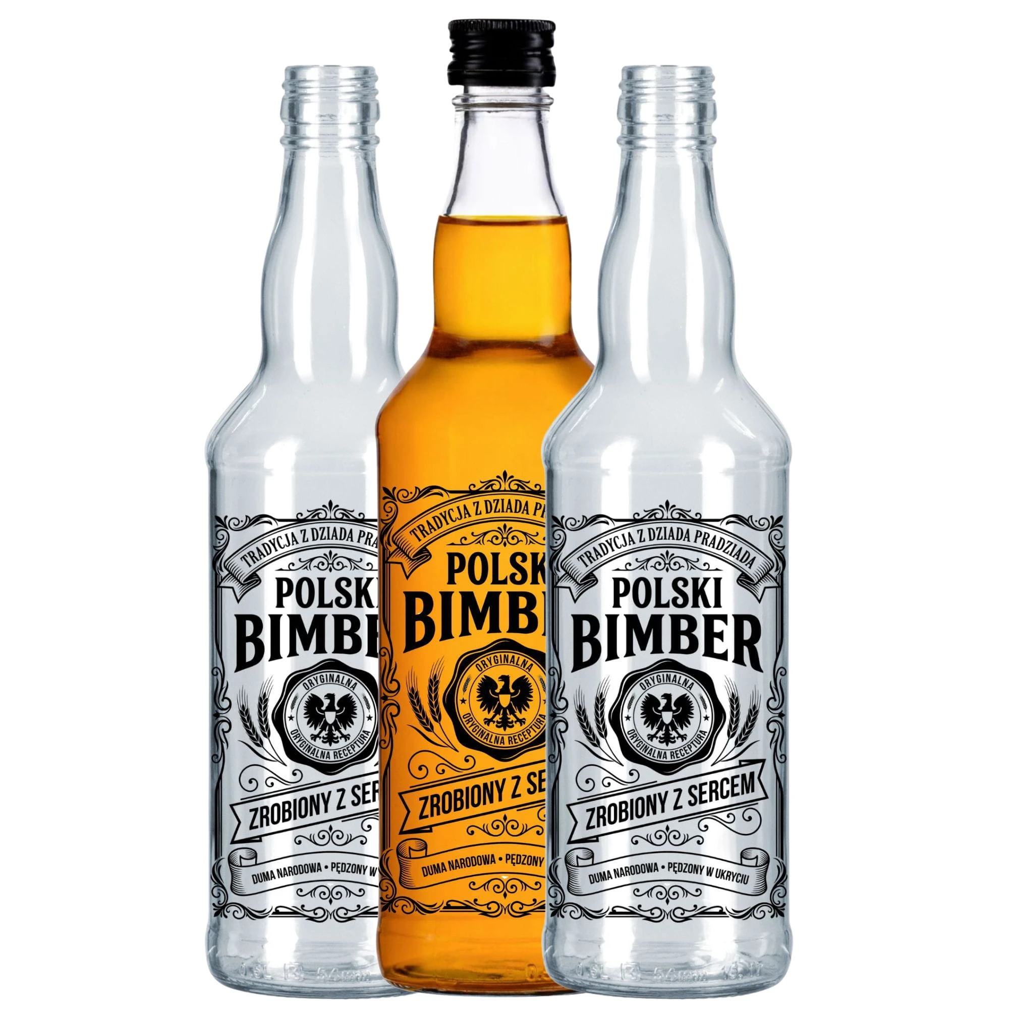 Kompletujesz oprawę na wiejski stół i szukasz szkła z prawdziwym polskim charakterem? Zgarnij profesjonalny zestaw 20 sztuk sprawdzonych butelek szklanych w klasycznej linii monopolowej o pojemności 500ml. Te wyjątkowe, zgrabne karafki wyróżnia wtopiony, czarny sitodruk z dostojnym orłem i hasłem "Tradycja z Dziada Pradziada - Polski Bimber - Zrobiony z sercem". W tym pakiecie otrzymujesz niezawodne opakowania szklane gotowe do zalania oraz dwadzieścia dołączonych, uszczelniających czarnych zakrętek. Ponieważ już jutro bladym świtem ruszasz z produkcją swojej legendarnej, domowej cytrynówki, te prestiżowe butelki na wódkę weselną będą czekać, by zabezpieczyć Twój alkohol z zachowaniem najlepszych, staropolskich tradycji!