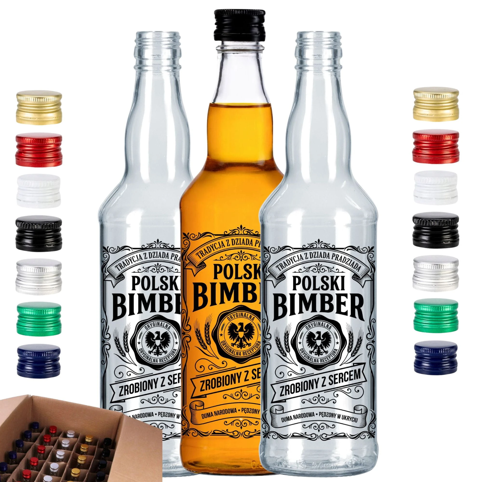 2. Co dokładnie znajdę w mojej przesyłce od kuriera?Otrzymasz 20 butelek monopolowych (500ml) z wtopionym sitodrukiem "Polski Bimber" oraz 20 czarnych zakrętek aluminiowych.
