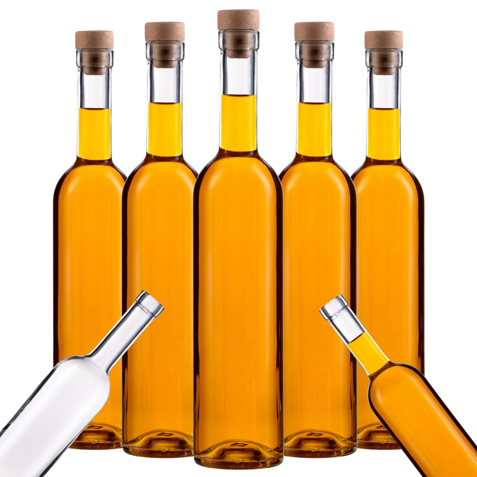 Zestaw 30 szklanych butelek Futura 500 ml z korkiem grzybkiem – eleganckie i smukłe butelki szklane Dr Bimber, stworzone na nalewki, bimber, wódkę, likiery, wino oraz domowe soki. Idealne na prezent i jako oryginalne upominki dla gości weselnych.