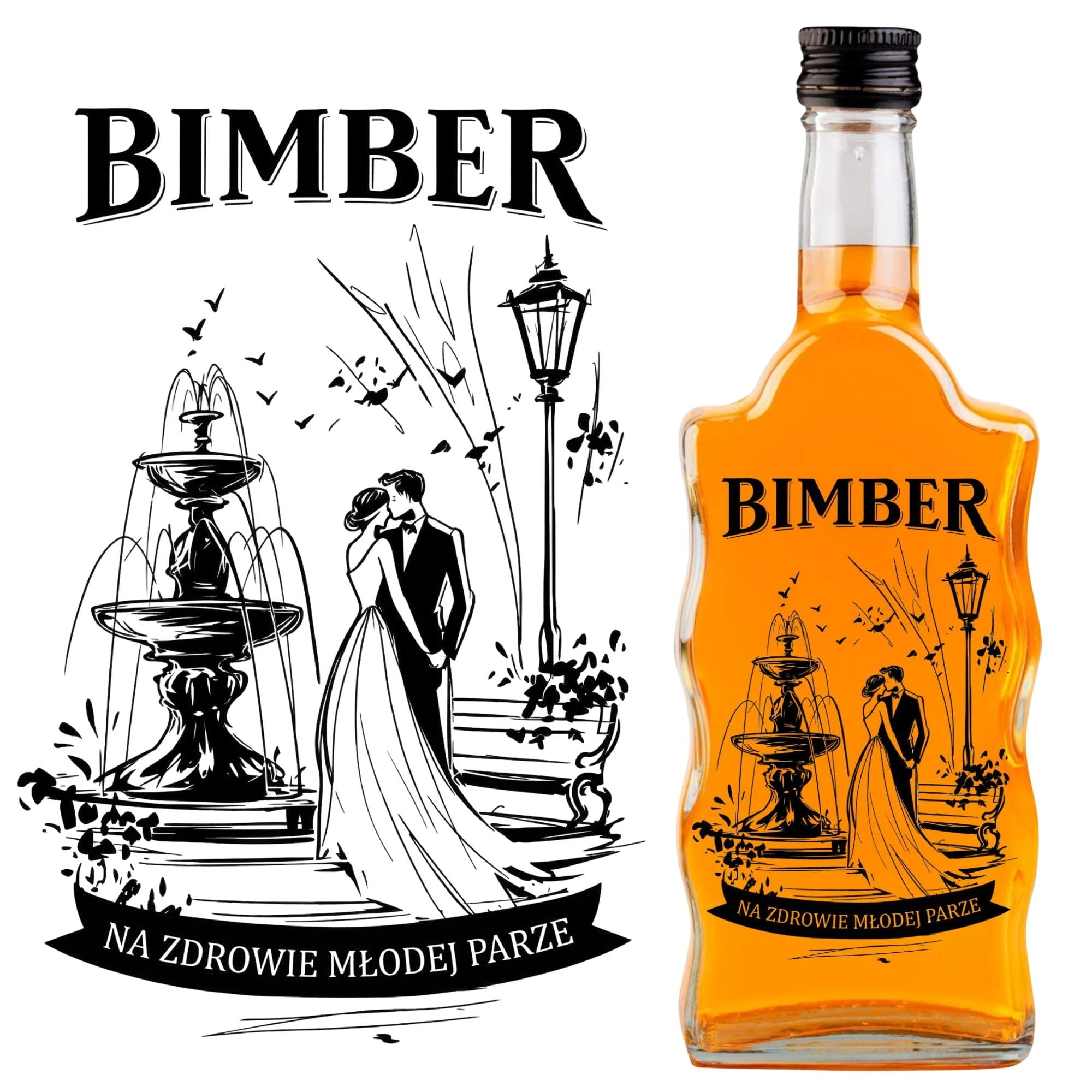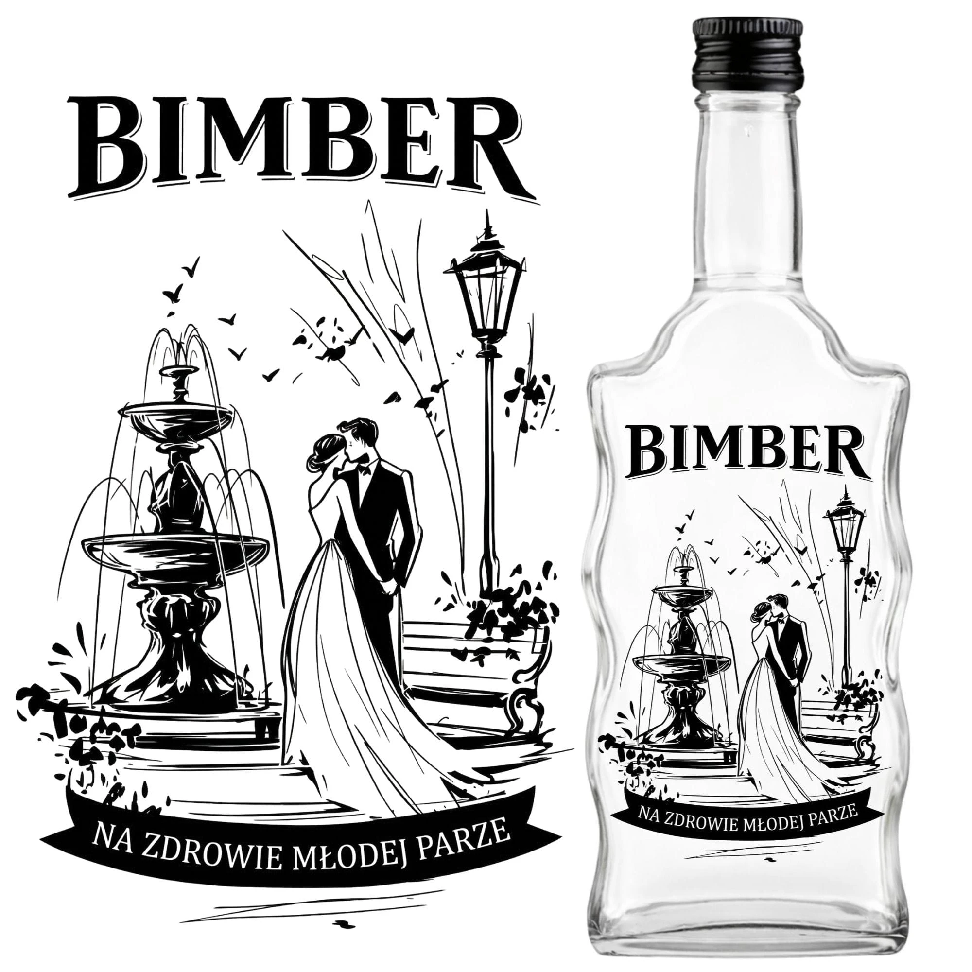 - Zdobienie: Odporna na wszystko szklana butelka z nadrukiem ślubnym (czarny sitodruk).