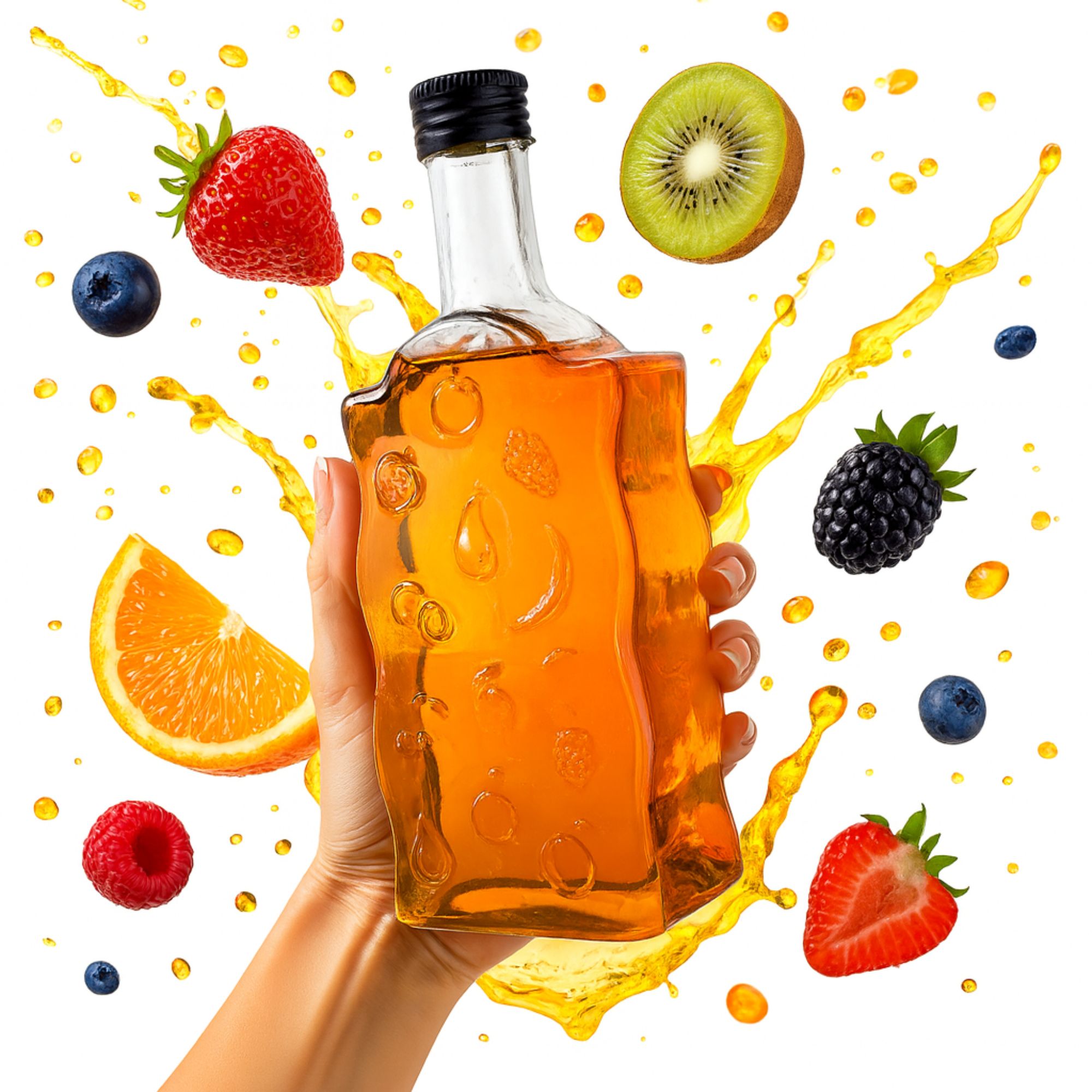 40 x BUTELKA FALA OWOCE 500 ML + ZAKRĘTKA – ozdobne szklane butelki z wytłoczonymi owocami. Idealne na nalewki, bimber, wódkę, likiery i soki. Efektowny zestaw w stylu Dr Bimber.