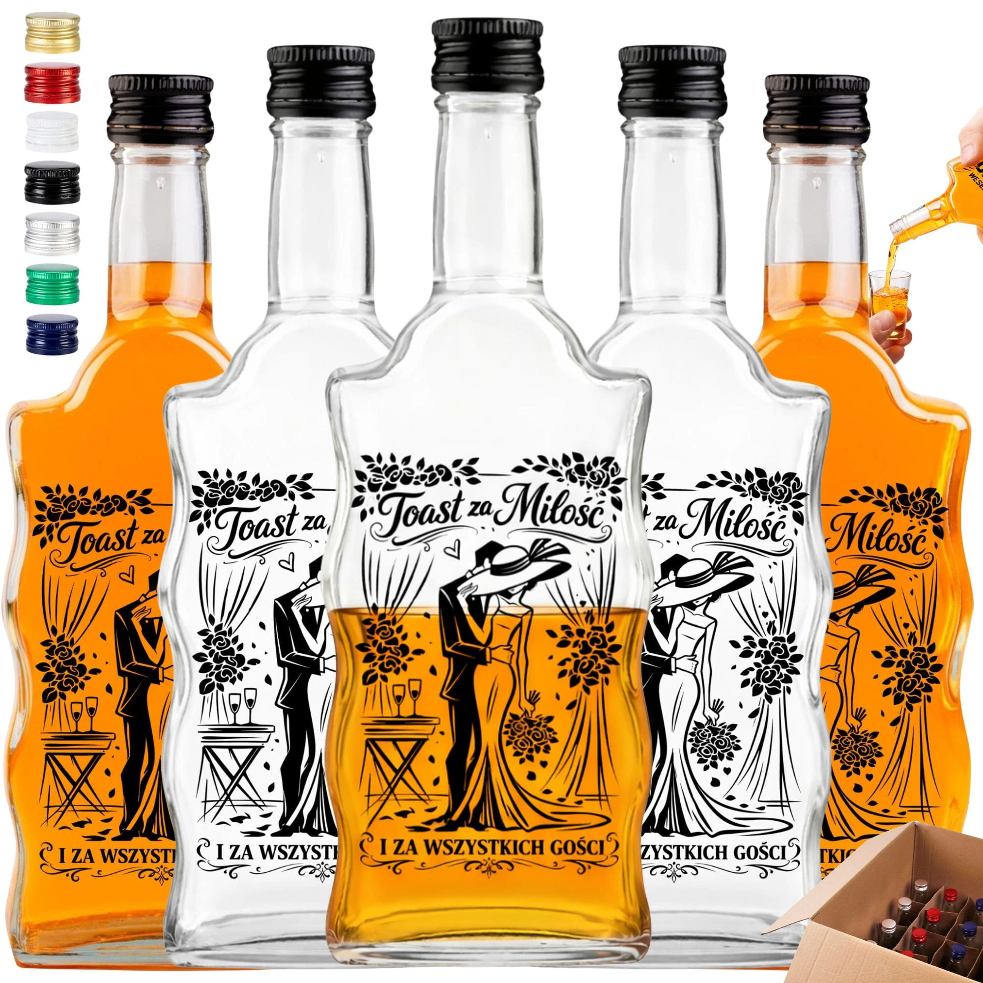 Szykujesz weselny stół lub szukasz eleganckich podziękowań dla najważniejszych gości? Wybierz pakiet 5 sztuk szklanych butelek Fala o pojemności 500 ml z przepięknym, romantycznym nadrukiem "Toast za Miłość i za wszystkich gości"! W zestawie z tym profesjonalnym szkłem otrzymujesz komplet 5 nowych, w 100% szczelnych zakrętek monopolowych. Dr Bimber dostarcza najwyższej jakości puste opakowania z niezniszczalnym sitodrukiem, a Twoim zadaniem jest uwarzyć wybitny domowy bimber/wódka lub obłędną cytrynówkę. Rozlej swój trunek z klasą i podaruj biesiadnikom jakość, której długo nie zapomną!