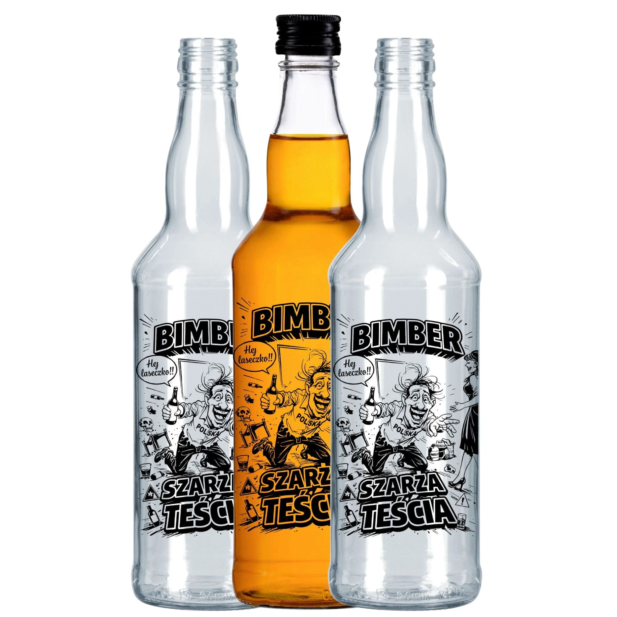 Przy rozlewie i operowaniu 60 flaszkami w ferworze imprezy, nie ma miejsca na żadne delikatne rozwiązania. Klasyczna butelka monopolowa to synonim pewnego chwytu przy ciągłym polewaniu szalonych toastów. Najprawdziwszą magię robi jednak nasza technologia znakowania, która bezlitośnie deklasuje zwykłe etykiety na butelki. Nasze butelki ozdobne z sitodrukiem wypiekane są w potężnym piecu w 600°C. Oznacza to, że czarny motyw bawiącego się teścia jest twardy jak lity głaz – całkowicie obojętny na wodę, rozlany alkohol, otarcia o sąsiednie szkło i ostre mrożenie w barze.