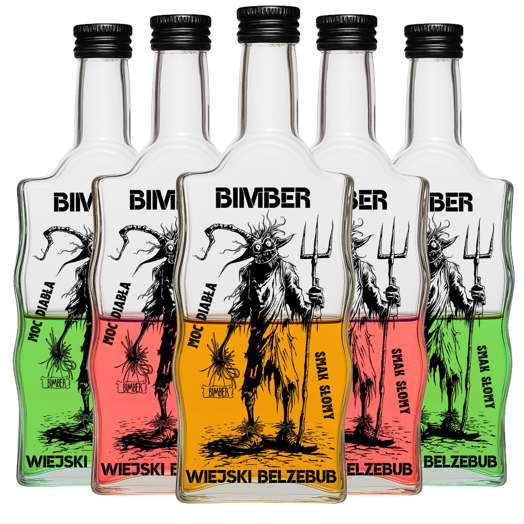 Zestaw 10 sztuk butelek szklanych 500 ml „Wiejski Belzebub” z czarnym nadrukiem odpornym na ścieranie. Każda butelka w komplecie z czarną zakrętką. Idealne na bimber, nalewki, wino i inne domowe trunki.